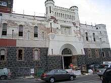 The First Regiment Armory in Portland was completed in 1888, but was immediately deemed too small, and so an Annex was commissioned to give troops stationed there more space for maneuvers. Amenities included an underground firing range.[2][3] Constructed in 1891, the annex was built in the Romanesque Revival style that was popular from 1880–1890 and is identified by massive stone cladding and semi-circular arcades. McCaw and Martin featured many Northwest quarry materials in the design.[4] The annex is also an example of Castellated architecture. The fortress-like structure has a recessed arched entrance flanked by turrets above. The turrets have crenelated parapets and loophole vertical gun slots.[5]
