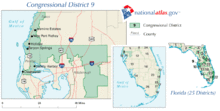 From 2003 to 2012, it encompassed most of rural eastern Hillsborough County, northern parts of Pinellas County (including Clearwater) and the Gulf coast of Pasco County (including New Port Richey). The redistricting on January 3, 2013, completely reassigned the boundaries of the 9th district to mostly Osceola County with central Orange County plus northeastern Polk County,[1][2] while the former 9th district became parts of the 10th, 11th, 12th (Pasco County) or the 14th district which split Hillborough County with the 15th and 17th district. The 2013 redistricting also expanded the State of Florida from 25 to 27 districts, adding 2 at Miami-Dade County, Florida.