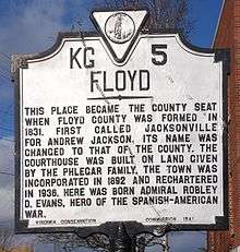 Floyd is a town in Floyd County, Virginia, United States. The population was 425 at the 2010 census. It is the county seat of Floyd County.[3] The Town of Floyd was originally named Jacksonville as the surrounding county was formed during the tenure of President Andrew Jackson. The name was subsequently changed to Floyd for Virginia governor John Floyd.[4]