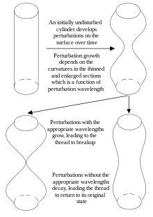 The first correct analysis of fluid thread breakup was determined qualitatively by Young and mathematically by Laplace between 1804 and 1805.[2][3] They correctly attributed the driver of thread breakup to surface tension properties. Moreover, they also deduced the importance of mean curvature in the creation of excess pressure in the fluid thread. Through their analysis, they showed that surface tension can behave in two ways: an elastic mechanism that can support a hanging droplet and a pressure mechanism due to capillary pressure that promotes thread breakup.