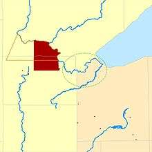 Fond du Lac Indian Reservation. (1854-1858 reservation shown in orange outline. 1858-present reservation shown in dark red.) Original core Fond du Lac Band area before relocation to the Fond du Lac Indian Reservation shown in green.