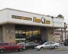 Food 4 Less is a national warehouse store grocery chain, currently owned by Kroger.[1] It is a no-frills grocery store where the customers bag their own groceries at the checkout. Kroger operates Food 4 Less stores in California, Illinois, Indiana, and Ohio. In markets that Kroger does not have the rights to the Food 4 Less name, it operates as Foods Co.