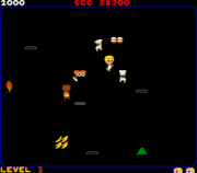 Scattered throughout the level are piles of food, such as pies, peas, tomatoes, and bananas. Both the player and the chefs can grab food from the piles to throw at each other. The supplies of most foods are limited, but watermelon, which appears either on special levels exclusively or with other foods in later levels, is unlimited in supply.[1] If the chefs are hit by food thrown either by the player or by other chefs, they are taken down for a few seconds.[1] If the player is hit, a life is lost. The player also loses a life if a chef touches Charley, if Charley falls through an open hole, or if the ice cream melts before it is eaten.[1]