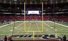 A field goal (FG), worth three points, is scored when the ball is placekicked or dropkicked through the uprights and over the crossbars of the defense's goalposts.[56][57][58] After a PAT attempt or successful field goal the scoring team must kick the ball off to the other team.[59] A safety is scored when the ball carrier is tackled in his own end zone. Safeties are worth two points, which are awarded to the defense.[40] In addition, the team that conceded the safety must kick the ball to the scoring team via a free kick.[60]