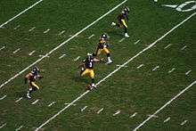 Football games last for a total of 60 minutes in professional and college play and are divided into two halves of 30 minutes and four quarters of 15 minutes.[71][72] High school football games are 48 minutes in length with two halves of 24 minutes and four quarters of 12 minutes.[73] The two halves are separated by a halftime period, and the first and third quarters are also followed by a short break.[71][72][74] Prior to the start of the game, the referee and team captains for each team meet at midfield for a coin toss. The visiting team is allowed to call 'heads' or 'tails'; the winner of the toss is allowed to decide from between choosing whether to receive or kick off the ball or choosing which goal they want to defend, but they can also defer their choice until the second half. The losing team, unless the winning team decides to defer, is allowed to choose the option the winning team did not select, and receives the option to receive, kick, or select a goal to defend to begin the second half. Most teams choose to receive or defer, because choosing to kick the ball to start the game would allow the other team to choose which goal to defend.[75] Teams switch goals following the first and third quarters.[76] If a down is in progress when a quarter ends, play continues until the down is completed.[77][78][79]