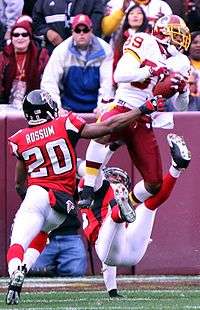 The defensive backfield, often called the secondary, consists of cornerbacks (CB) and safeties (S). Safeties are themselves divided into free safeties (FS) and strong safeties (SS).[45] Cornerbacks line up outside the defensive formation, typically opposite of a receiver so as to be able to cover him, while safeties line up between the cornerbacks but farther back in the secondary. Safeties are the last line of defense, and are responsible for stopping deep passing plays as well as running plays.[45]