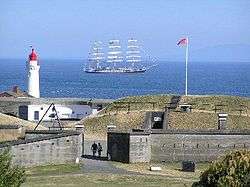 Russian tall ship Pallada in front of Fort Rodd Hill's Lower Battery, 2005.