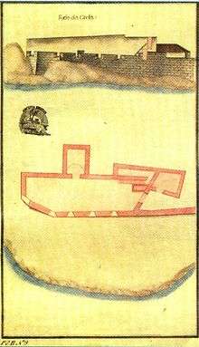 The bastion fortification has an organic plan, adapted to the terrain, with walls in stonework, broken by four canon emplacements oriented to the bay, while two towards the south.[6] The gunpowder magazine was partially excavated into the cliff face of the flank along the promontory of Santa Catarina. There are still vestiges of barracks and a earthen kiln to produce the ammunition.