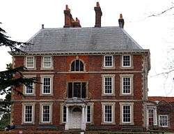 The original square house was not altered much in the 17th century other than a small extension to the north-west in 1636.[5] In 1640 Rainton was imprisoned for refusing to help Charles I raise a loan. He died in 1646 aged 77 and was buried at St Andrew's Church in Enfield.[1] The hall then passed to his great-nephew, also Nicholas. He was able to extend the estate northwards by buying and demolishing the neighbouring Elsyng Palace in 1656. In 1696 the hall passed to John Wolstenholme (probably a descendent of the financier and merchant of the same name and member of the Virginia Company), who carried out major refurbishment possibly following a fire, including construction of an extension to the south-west, and planted the avenue. In 1740 the house passed to Eliab Breton, who remodelled the ground floor. Later owners included Edmund Armstrong (1787) and James Meyer (1799), whose family built the nearby Jesus Church in 1835. In 1894 the hall was bought by Henry Carrington Bowles[5] of the neighbouring Myddelton House for his son Major Henry Ferryman Bowles (1858–1943), MP for Enfield and later 1st Baronet Bowles.[6] In 1897 there were further changes including enlargement of the south-west wing. In 1951 the Bowles family sold it to the Municipal Borough of Enfield, the predecessor of the London Borough of Enfield. It has since been used as a museum.