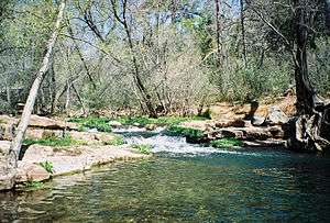 - ↑ The stream gauge at Fossil Creek Bridge was installed in September 2010. Before that, the creek was never gauged, although the flume was gauged and the Verde River was gauged at Tangle Creek, below the mouth of Fossil Creek. The average discharge of 43 cubic feet per second (1.2 m3/s) cited here represents the base flow emanating from Fossil Springs. The maximum and minimum flows were measured at the bridge in 2010 and 2011.[6][7]