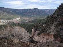 From high on the rim, the creek runs generally north, entering Gila County almost immediately. It continues north through the wilderness to the confluence of an intermittent stream in Calf Pen Canyon, which enters from the right.[5] Turning west, the creek receives another intermittent stream from the right in Sandrock Canyon, at the head of Fossil Creek Canyon. Before it reaches Fossil Springs, the creek becomes the boundary between Gila County on the stream's left and Yavapai County on its right, and it remains the boundary all the way to the Verde River.[5]
