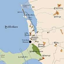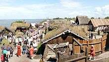 The museum occupies an approximately 70,000 square metres (17 acres) site on Höllviken Bay. In addition to a reconstruction of a large Viking Age settlement, the 'Viking Reserve', there are research and handicrafts buildings and three large halls, including a restaurant seating up to 200 and a feast hall. The gate to the reserve is indicated on the museum map as a "border gate" between Sweden and the reserve.[4] Buildings in the reserve are built or rebuilt by staff and volunteers almost every season, with traditional methods being supplemented by modern technology in winter;[5] as of 2010 there were about 22, including a tapestry-lined chieftain's house[6] and a hof.[7] The reserve opens for the summer season on May Day,[3] and is intended as a recreation of a large settlement late in the Viking Age, during the transition to the Scandinavian Middle Ages and the increasing influence of Christianity in the North.[8] This enables the museum to include the Battle of Fotevik, which clearly belongs to the medieval period.[9] Those staying in the reserve live as Viking Age people[6] and are not permitted to have modern equipment or wear modern clothing.[10] It is marketed as open to "all Vikings"[11] and attracts large numbers of Viking Age reenactors;[2][7] many of the visitors are from outside Scandinavia, particularly from Germany.[12] An international viking thing is held in the Tinghöll building every year; according to the museum, in 2001 66 representatives from 22 countries were present.[9]