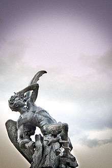 The statue that crowns the monument is the masterpiece of Ricardo Bellver who realized it in plaster in 1877 while a 3rd year pensioner in Rome, inspired by verses from Paradise Lost of Milton (Canto I).[1] He submitted it to the 1877 edition of the Exposiciones Nacionales de Bellas Artes where it received the first prize.[2] The state acquired the work and presented it to the 1878 Exposition Universelle. Since only works in marble and bronze were accepted, the statue was cast in bronze at this occasion and the plaster original destroyed. The statue returned to Spain in what was then the Museo Nacional de Pintura y Escultura (also known as the Museo de la Trinidad, now part of the Museo del Prado). The director of the museum, Benito Soriano Murillo, proposed its relocation in the open space so that the public could freely enjoy this peculiar and unusual creation. The statue was passed to the city hall[3] that placed it on the spot of its present location which was formerly occupied by the Real Fábrica de Porcelanas de la China before its destruction during the French invasion in 1813, at the intersection of the paseo de Cuba, the paseo de Uruguay and the paseo del Duque de Fernán Nuñez in the Retiro park. The duque de Fernán Nuñez (probably Manuel Falcó y d´Adda y Valcárcel, the husband of the III Duquesa de Fernán Núñez)[4] sponsored the monument. The architect Francisco Jareño was charged to design the pedestal, that is octagonal with figures of devils on each side gripping fishes, lizards and snakes, and placed at the center of a fountain of 10 meters diameter, itself surrounded by a parterre. The inauguration was made by the Queen consort of Spain Maria Christina of Austria in 1885. The monument is 7 meters high (the statue itself is 2.65 meters) and lies at the center of a roundabout named after the statue, that also gives its name to an entrance of the park.