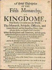 In the conditions leading to the English Civil War and the disruption that followed, many Protestants were millennarians, believing they were living in the 'end of days'.[41] The Fifth Monarchists were a significant element of the Parliamentary grouping and, in January 1661, after Charles II took the throne following the English Restoration, 50 militant Fifth Monarchists under Thomas Venner attempted to take over London to start the 'Fifth Monarchy of King Jesus'. After the failure of this uprising, Fifth Monarchists became a quiescent and devotional part of religious dissent.[41]