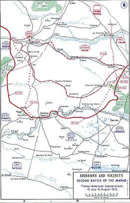 By May, Foch had spotted flaws in the German offensives.[3] The force which defeated the German offensive was mainly French, with American, British and Italian support. Co-ordinating this counter-attack would be a major problem as Foch had to work with "four national commanders but without any real authority to issue order under his own name[...]they would have to fight as a combined force and to overcome the major problems of different languages, cultures, doctrines and fighting styles."[3] However, the presence of fresh American troops, unbroken by years of war, significantly bolstered Allied resistance to the German offensive. Floyd Gibbons wrote about the American troops, saying, "I never saw men charge to their death with finer spirit."[4]