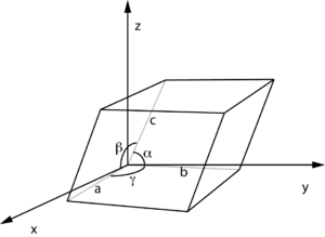 - ↑ "Unit cell definition using parallelepiped with lengths a, b, c and angles between the edges given by α, β, γ". Ccdc.cam.ac.uk. Retrieved 2016-08-17.