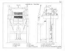 Lee's machine consisted of a stout wooden frame. It did straight knitting not tubular knitting. It had a separate needle for each loop- these were low carbon steel bearded needles where the tips were reflexed and could be depressed onto a hollow closing the loop. The needle were supported on a needle bar that passed back and forth, to and from the operator. The beards were simultaneously depressed by a presser bar. The first machine had 8 needles per inch and was suitable for worsted: The next version had 16 needles per inch and was suitable for silk.[1]
