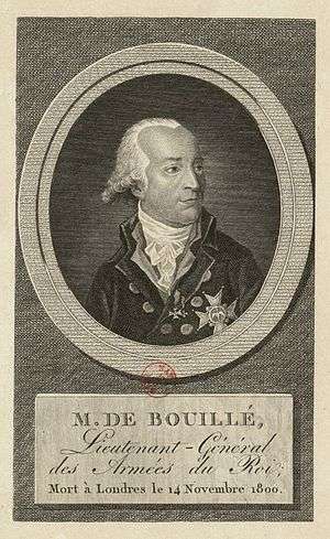 François Claude Amour, marquis de Bouillé (19 November 1739 – 14 November 1800) was a French general. After distinguishing himself in the Seven Years' War, he was appointed governor of Guadeloupe in 1768. His most well-known military exploits took place in the West Indies during the American War of Independence, where he was involved in the French capture of a number of British possessions. Following that war he returned to France, where he held military commands in the country's northeast at the time of the French Revolution. A committed Royalist, he was a leading conspirator involved in the royal family's failed flight in 1791, whose failure forced de Bouillé into exile. He continued to be active in consultative roles to members of the First Coalition, which opposed the forces of Revolutionary France in the early years of the French Revolutionary War. He died in exile in London, and is mentioned as a hated Royalist in the French national anthem, La Marseillaise.