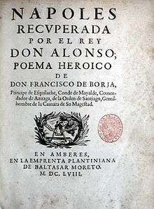 - Naples recuperada por el Rey Alfonso (Naples Regained by King Alfonso V of Aragon). Epic poem in eight-line stanzas and 12 cantos, 1651.