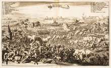 By the end of 1675, even those English troops that had been serving in the French armies as mercenaries were being called home. By December 1675, Marlborough and all his troops were in Paris on their way home.[37] Also in 1675, the Great Condé was becoming so incapacitated with gout and other infirmities, that he was unable to carry out all his duties without help. Consequently, Louis was required to raise a new army with a new general. Accordingly, between 5,000–6,000 men were raised and placed under the command of Marshal François-Joseph, marquis of Créqui.[38] In early December 1674, Turenne prepared to go out on this winter campaign. On 29 December 1674, he surprised and smashed the Imperial cavalry at Mulhouse.[39] Then, Turenne marched for Colmar where he expected to meet the army of Frederick William, who had managed to gather 30,000 to 40,000 of his men out of winter quarters and take up a defence line between Colmar and Turkheim. However, the latter army still had not gelled in place on 5 January 1674, when Turenne attacked with 30,000 French troops.[40] Turenne feigned an attack to the right and then to the center, while hidden by the terrain, some of his infantry moved around to the left and took the town of Turkheim on Frederick William's flank.[36] An attempt to retake Turkheim was defeated under heavy fire from the French and an infantry charge. Frederick William retreated back to Strasbourg and crossed over to the eastern Rhine bank.[36]