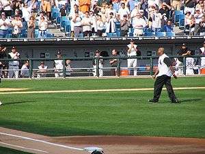 Frank Thomas throws out the ceremonial first pitch of the 2005 ALDS between the White Sox and Red Sox.