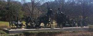 Public art displayed along Freedom Parkway includes Homage to King, a sculpture by Spaniard Xavier Medina-Campeny at the corner of Boulevard, which portrays Martin Luther King, Jr. outstretching his arms, and welcomes those visiting the King Historic Site.[1][2] The Bridge, by Thornton Dial, at Ponce de Leon Avenue.[3][4] portrays congressman John Lewis' "lifelong quest for civil and human rights" and the community's "valiant efforts" to stop the construction of freeways and preserve intown neighborhoods".[5]