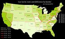 The United States federal excise tax on gasoline is 18.4 cents per gallon and 24.4 cents per gallon for diesel fuel.[1][2] On average, as of July 2016, state and local taxes and fees add 29.78 cents to gasoline and 29.81 cents to diesel, for a total US average fuel tax of 48.18 cents per gallon for gas and 54.21 cents per gallon for diesel.[3]