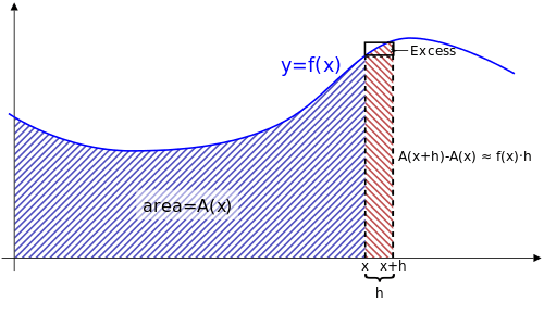 The area shaded in red stripes can be estimated as h times f(x). Alternatively, if the function A(x) were known, it could be computed exactly as A(x + h) − A(x). These two values are approximately equal, particularly for small h.