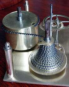 Used in antique spring-powered mechanical watches and clocks, a fusee is a cone-shaped pulley with a helical groove around it, wound with a cord or chain which is attached to the mainspring barrel. Fusees were used from the 15th century to the early 20th century to improve timekeeping by equalizing the uneven pull of the mainspring as it ran down. Gawaine Baillie stated of the fusee, "Perhaps no problem in mechanics has ever been solved so simply and so perfectly."[1]