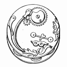 The origin of the fusee is not known. Many sources erroneously credit clockmaker Jacob Zech of Prague with inventing it around 1525,[2][3][4] but it actually appeared with the first spring driven clocks in the 15th century.[1][5] The idea probably did not originate with clockmakers, since the earliest known example is in a crossbow windlass shown in a 1405 military manuscript.[1] Drawings from the 15th century by Filippo Brunelleschi[6] and Leonardo da Vinci[7] show fusees. The earliest existing clock with a fusee, also the earliest spring-powered clock, is the Burgunderuhr (Burgundy clock), a chamber clock whose iconography suggests that it was made for Phillipe the Good, Duke of Burgundy about 1430, now in the Germanisches Nationalmuseum[1][5] The earliest definitely dated fusee clock was made by Zech in 1525. The word fusee comes from the French fusée and late Latin fusata, 'spindle full of thread'.