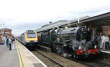 King Edward I is overtaken by a High Speed Train while taking water at Taunton while working a Torbay Express service.