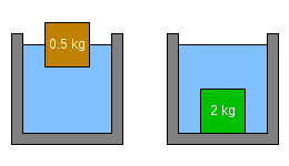 Suppose there are two objects, each with a volume of 1 L (0.22 imp gal; 0.26 US gal). The mass of water displaced by an object of this size is 1 kg (2.2 lb). The brown object on the left is floating because the mass of water it would displace if completely submerged (1 kg (2.2 lb)) is greater than the mass of the object. It floats half submerged because that is the point where the mass of the water displaced (0.5 kg (1.1 lb)) is equal to the mass of the object. The green object on the right has sunk because the mass of water it is displacing (1 kg (2.2 lb)) is less than the object's mass (2 kg (4.4 lb)).