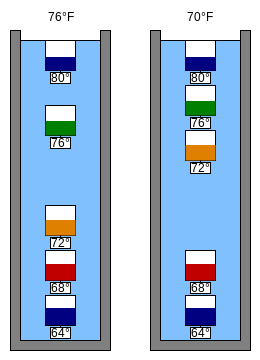 In some models, if there are some bulbs at the top (Figure 4, left) and some at the bottom, but one floating in the gap, then the one floating in the gap (green 76 °F (24 °C)) tells the temperature. If there is no bulb in the gap (Figure 4, right) then the average of the values of the bulb above and below the gap gives the approximate temperature. In other models, the lowest floating bulb gives the approximate temperature.[6]