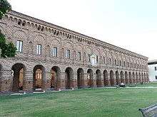 The galleria or gallery was once a corridor, aligned south to north, linked to the large Sabbioneta Castle that stood inside the walled town. Described as a "grand corridor" of the castle, it was built with stone and brick in 1584–1586. It connects to the externally drab Palazzo Giardino, which through a second portico (corridor piccolo), once connected to the castle. The statuary collection was acquired in the 16th century by Vespasiano Gonzaga[1] from antique dealers and collectors of northern Italy, as well as much of it carried away as booty by his father after the imperial Sack of Rome in 1527.[2] The hunting trophies originated from imperial collections in Prague. Much of this collection remained in the palace until 1773, when the Austrian authorities transferred them to the Palace of the Accademia di Mantova, leaving the gallery an elegant but vacant shell of its former state. In 1915 the renamed Accademia Nazionale Virgiliana ceded the collection to the comune, which has since moved it to the Palazzo Ducale of Mantua. Many pieces however, were either sold or looted in the imperial Sack of Mantua (1630) during the War of the Mantuan Succession.[3]
