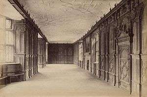 In architecture, a long gallery is a long, narrow room, often with a high ceiling. In Britain, long galleries were popular in Elizabethan and Jacobean houses. They were often located on the upper floor of the great houses of the time, and they stretched across the entire frontage of the building. They served several purposes: they were used for entertaining guests, for taking exercise in the form of walking when the weather was inclement, and for displaying art collections.