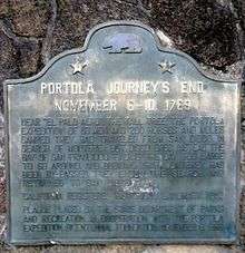 The city of Portola in Plumas County,[2] the town of Portola Valley in San Mateo County, and the Portola neighborhood of San Francisco were named after Portolá. A number of schools in California were also named after him, including Portola Hills Elementary School in Portola Hills, Portola Elementary School in San Bruno, Portola Junior High School in El Cerrito, Gaspar de Portola Middle School in Tierrasanta, Portola Middle School in Tarzana, and Portola Middle School in Orange. The school in Orange is close to the spot where the expedition crossed the Santa Ana River, and the school has a 60-foot mural depicting the Portola Expedition.
