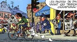 Yves Lebrac, (first presented with the name Yvon Lebrac),[23] an in-house cartoonist, is comparatively laid-back. He is fond of puns and we see him woo (and eventually win) one of the attractive secretary girls over the course of the series. Although mostly on good terms with Gaston (unlike Prunelle), he occasionally loses his temper when deadlines loom and Gaston's interference becomes too much. When not a victim of "gaffes", he is a lenient comrade of Gaston, and the character with which Franquin himself most identified.[24]