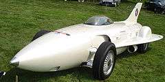 By 1953, the research team had produced the Firebird XP-21,[1] later referred to as the Firebird I, which was essentially a jet airplane on wheels. It was the first gas turbine-powered car tested in the United States. The design is entirely impractical, with a bubble-topped canopy over a single-seat cockpit, a bullet-shaped fuselage made entirely of fiberglass, short wings, and a vertical tail fin.[2] It has a 370 hp (280 kW) Whirlfire Turbo Power gas turbine engine, which has two speeds, and expels jet exhaust at some 1,250 °F (677 °C). The entire weight of the car is 2,500 lb (1,134 kg), with a 100-inch wheelbase.[3]