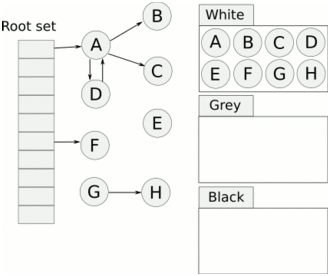 - Move each white object it references to the gray set. This ensures that neither this object nor any object it references can be garbage-collected.
