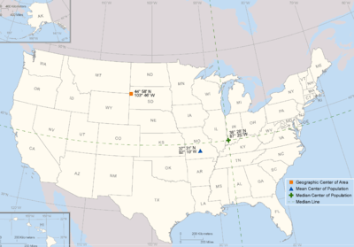 - ↑ Position of the Geographic Center of Area, Mean and Median Centers of Population: 2010 from the U.S. Census Bureau website