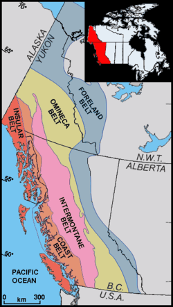 There are five morphogeological belts that define the geology of British Columbia from east to west: the Foreland, Omineca, Intermontane, Coast and Insular Belt. Each has a separate geology, including different metamorphic, physiographic, metallogenic and tectonic histories.