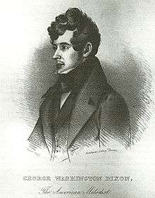 George Washington Dixon (1801?[1] – March 2, 1861) was an American singer, stage actor, and newspaper editor. He rose to prominence as a blackface performer (possibly the first American to do so) after performing "Coal Black Rose", "Zip Coon", and similar songs. He later turned to a career in journalism, during which he earned the enmity of members of the upper class for his frequent allegations against them.