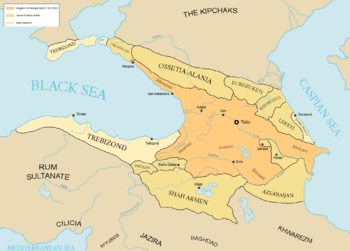 The 29-year reign of Tamar, the first female ruler of Georgia, is considered the most successful in Georgian history.[36] Tamar was given the title "king of kings" (mepe mepeta).[30] She succeeded in neutralizing opposition and embarked on an energetic foreign policy aided by the downfall of the rival powers of the Seljuks and Byzantium. Supported by a powerful military élite, Tamar was able to build on the successes of her predecessors to consolidate an empire which dominated the Caucasus, and extended over large parts of present-day Azerbaijan, Armenia, and eastern Turkey as well as parts of northern Iran,[37] until its collapse under the Mongol attacks within two decades after Tamar's death in 1213.[38]
