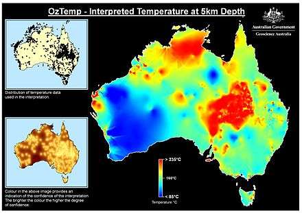 Geothermal power in Australia is little used but growing.[1] There are known and potential locations near the centre of the country that have been shown to contain hot granites at depth which hold good potential for development of geothermal energy. Exploratory geothermal wells have been drilled to test for the presence of high temperature geothermal reservoir rocks and such hot granites were detected. As a result, projects will eventuate in the coming years and more exploration is expected to find new locations.