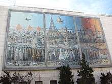 The northern façade of the Gerard Behar Center, facing Bezalel Street, features a 160-square-metre (1,700 sq ft) mural titled "Around the World in 92 Days".[29][30] The triptych painting is a large-scale reproduction of a 1976 painting by Jerusalem artist Gabriel Cohen; the original is housed in the Israel Museum.[29][30] Painted in naïve art style, the painting depicts world landmarks such as the Eiffel Tower and Arc de Triomphe in Paris, the Walls of Jerusalem and the Dome of the Rock in Jerusalem, the pyramids of Egypt, the Leaning Tower of Pisa, bridges in London, and sights in India, with people and animals of all kinds walking along the streets and bridges below.[7][30] The mural was produced by Cité de la Creation, which painted five trompe-l'œil murals in downtown Jerusalem.[29][30] On the sidewalk across the street from the mural stand five small pillars topped with engraved metal plates describing the work in Hebrew and English, and depicting reproductions of different parts of the painting for visually-handicapped persons, with explanations in Braille.