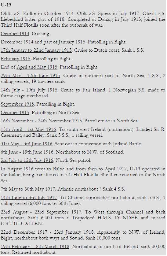 The following is a verbatim transcription of the recorded activities of SM U-19 known to British Naval Intelligence (better known as Room 40) during 1914-1918:[9]