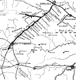 The Gettysburg and Harrisburg Railroad (G. & H. R. R.)[2] was a railway line of Pennsylvania from Hunter's Run southward to Gettysburg in the 19th century. The north junction was with the South Mountain RR,[3] and a crossing with the Hanover Junction, Hanover and Gettysburg Railroad's westward extension was at Gettysburg. The crossing also served as a junction for westbound trains to transfer southward across the Gettysburg Battlefield via the G. & H. R. R.'s Round Top Branch[4] to the company's Little Round Top Park.
