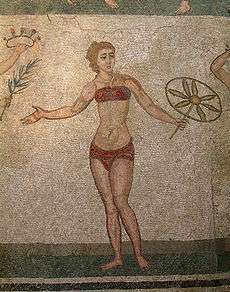 In 1959-60, Gino Vinicio Gentili excavated a mosaic on the floor of the room, later dubbed the "Chamber of the Ten Maidens", at the Villa Romana del Casale near Piazza Armerina. Informally called "the bikini girls", the maidens appear in a mosaic artwork which scholars named "Coronation of the Winner". The young women perform sports including weight-lifting, discus throwing, running and ball-games. A woman in a rich dress is depicted with a crown in her hand; one of the maidens holds a palm frond. The Villa in 1997 became a UNESCO World Heritage Site.