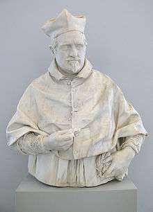 The difference between the two sculptors, Bernini and Finelli, was slight. Finelli is highly meticulous about carving tiny details, a focus which often seems to drain from the greater emotion of the piece. The prolific Bernini was less conscious of lacy frillery in dress, and more centered on the psychology. The contrast can be seen in their portraits of a common patron, Cardinal Scipione Borghese. Bernini's portraint[2] is animated, while Finelli's is more sober and has a slight downgaze.[3] He also completed the image of Cardinal Giulio Antonio Santorio (c. 1630) at San Giovanni in Laterano.