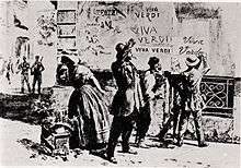 The growth of the "identification of Verdi's music with Italian nationalist politics" perhaps began in the 1840s.[97] In 1848, the nationalist leader Giuseppe Mazzini, (whom Verdi had met in London the previous year) requested Verdi (who complied) to write a patriotic hymn.[98] The opera historian Charles Osborne describes the 1849 La battaglia di Legnano as "an opera with a purpose" and maintains that "while parts of Verdi's earlier operas had frequently been taken up by the fighters of the Risorgimento...this time the composer had given the movement its own opera"[99] It was not until 1859 in Naples, and only then spreading throughout Italy, that the slogan "Viva Verdi" was used as an acronym for Viva Vittorio Emanuele Re D'Italia (Viva Victor Emmanuel King of Italy), (who was then king of Sardinia).[100] After Italy was unified in 1861, many of Verdi's early operas were increasingly re-interpreted as Risorgimento works with hidden Revolutionary messages that perhaps had not been originally intended by either the composer or his librettists.[101]
